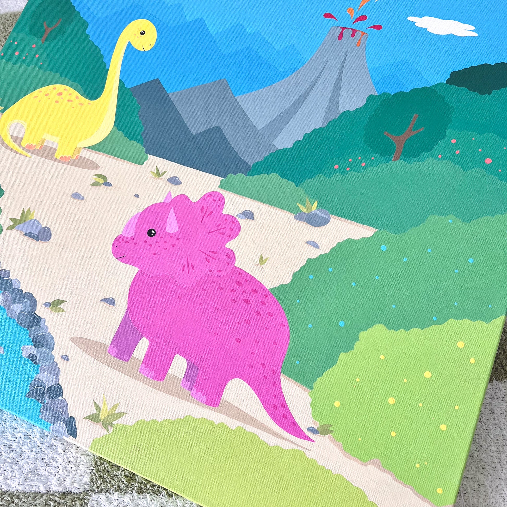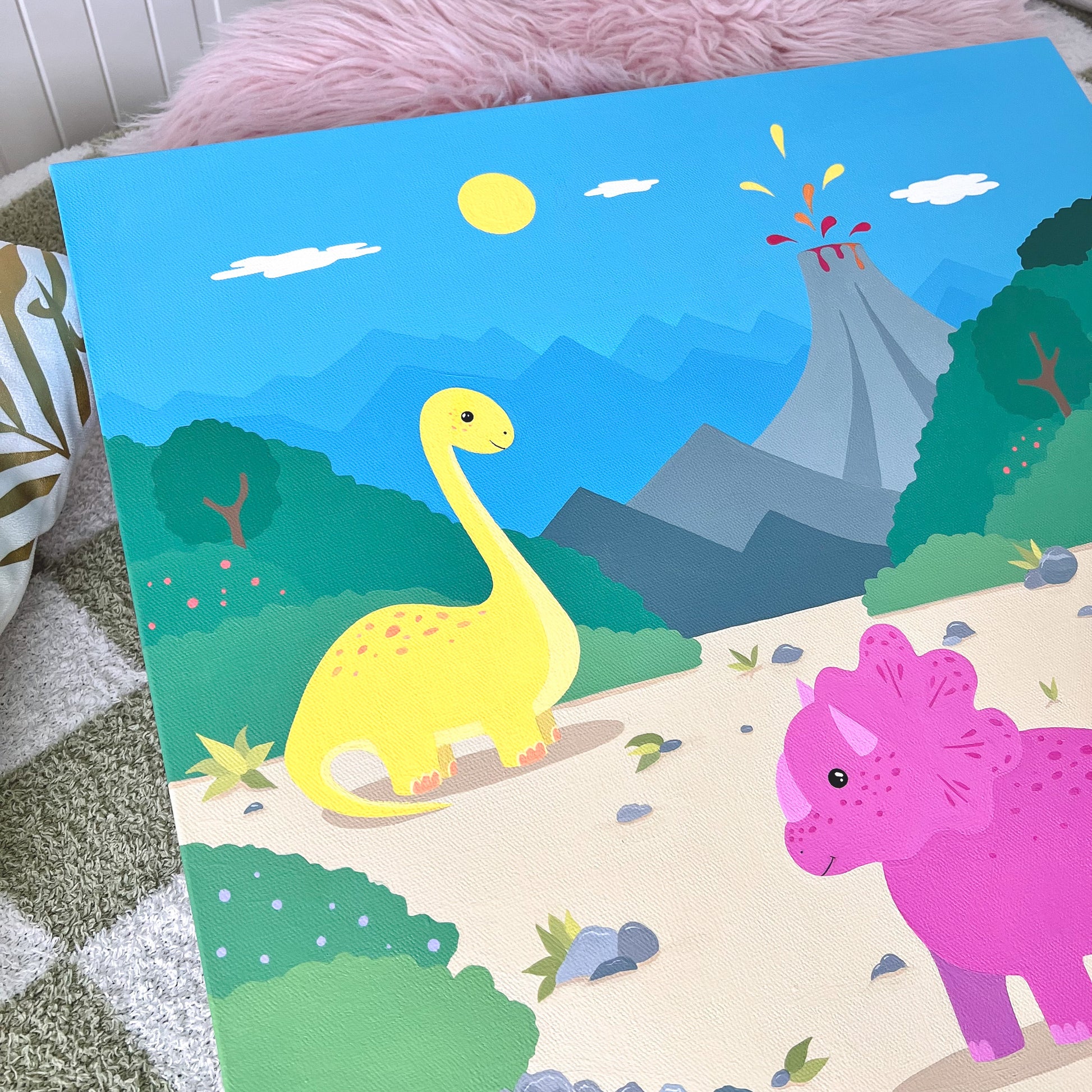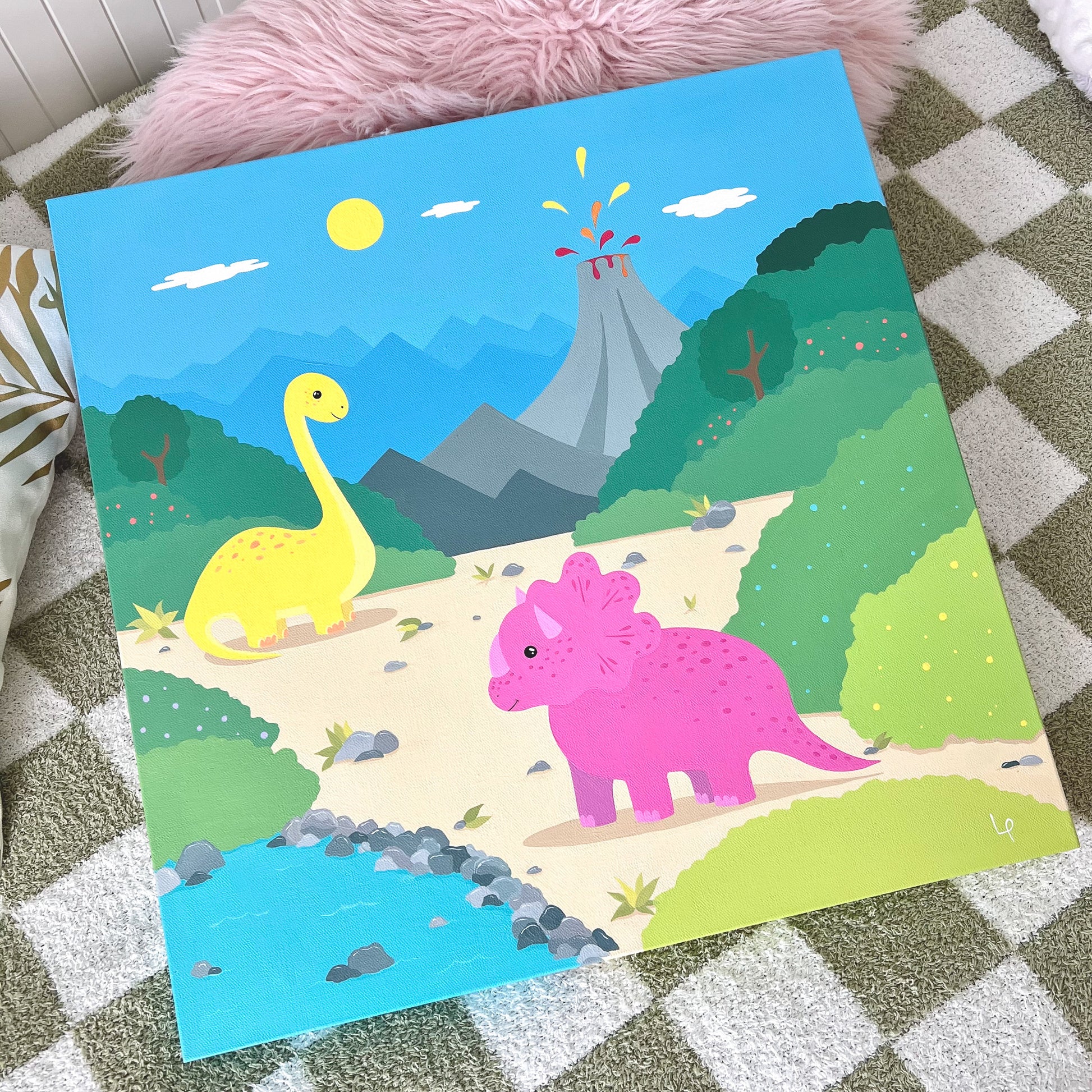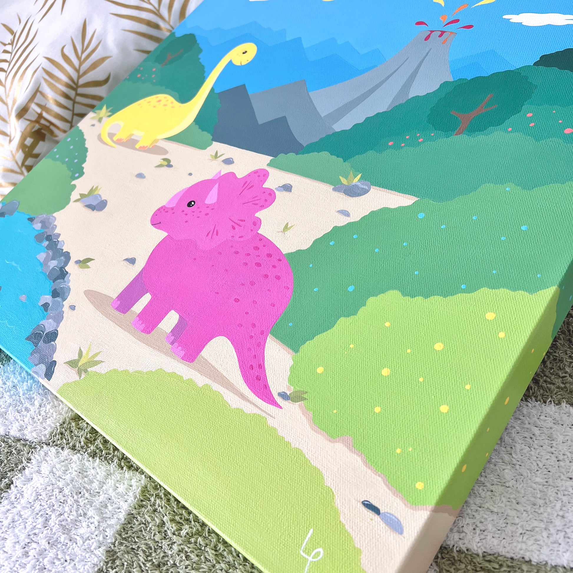 Add a pop of prehistoric fun to your little one’s space with this hand-painted 20" x 20" dinosaur canvas. Featuring cheerful dinos, lush greenery, and a playful volcano under a sunny sky, this vibrant scene is full of charm and adventure. Perfect for sparking curiosity and imagination, it’s a one-of-a-kind piece that brings color and joy to any nursery, playroom, or bedroom.